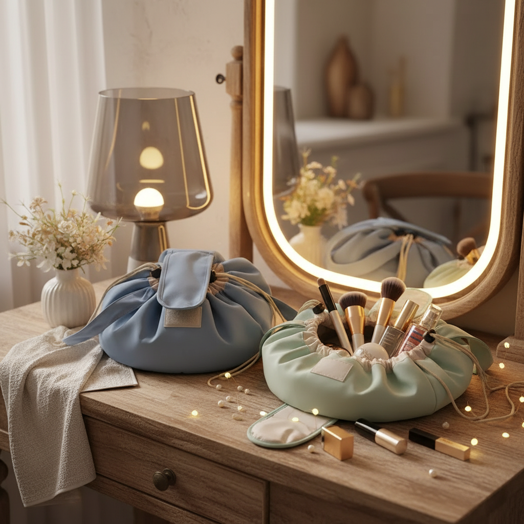 Tahle „líná kosmetická taška“ se rozloží do kruhu – všechny věci jsou přehledně vidět.