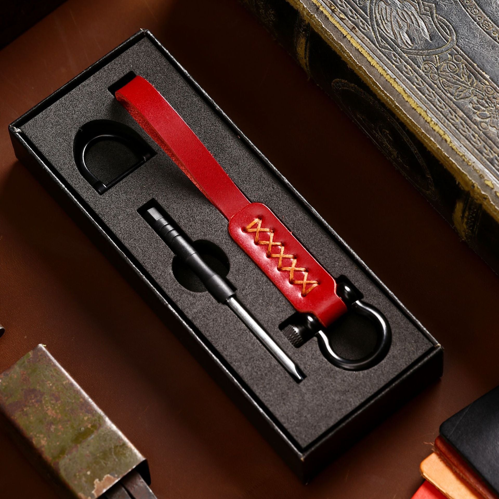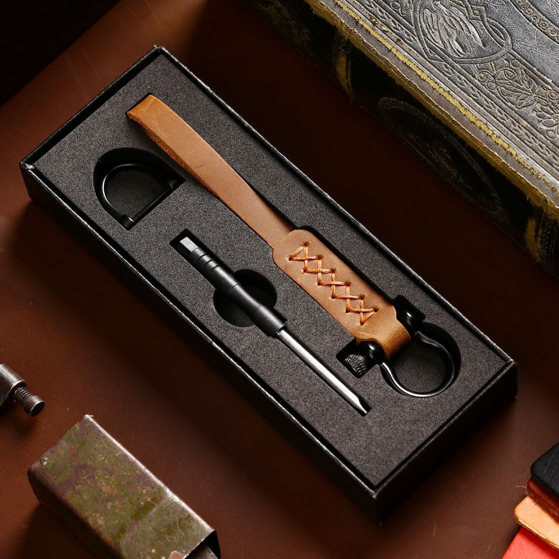 Vánoční retro multifunkční přívěsek na klíče – kožený přívěsek se šroubovákem a D-kroužkem
