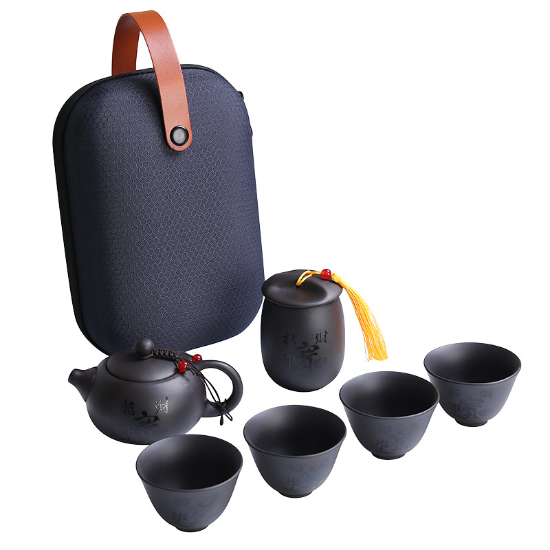 Tato přenosná čajová sada z tzv. „purple sand“ keramiky (Yixing clay) spojuje eleganci, kvalitu a praktičnost.