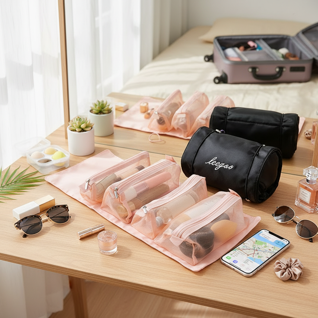 Taštička je vyrobena z lehkého textilního materiálu, který se snadno čistí a je velmi odolný proti běžnému opotřebení. Uvnitř najdeš kapsy a uspořádání, díky němuž má každá položka své místo — žádné hledání rtěnky v chaosu kabelky.